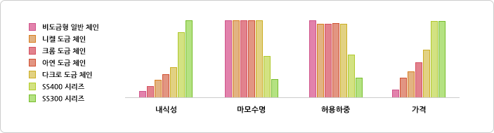 - 고품질의 스테인리스 재질을 사용한 체인으로 용도에 따라 SS300 시리즈(austenitic Stainless)와 SS400 시리즈(martensitic Stainless)가 선택 가능
