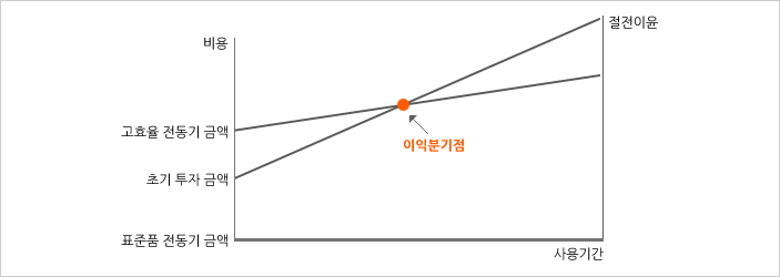 고효율전동기는 초기 투자비용이 표준품에 비하여 약 30∼50%정도 상승되나 대폭적인 효율상승에 따라 전력비용이 저감되어 초기 투자증가분을 단기간 내에 회수 가능할 뿐만 아니라, 운전시간이 길어질수록 더 많은 투자효과를 거둘 수 있습니다.