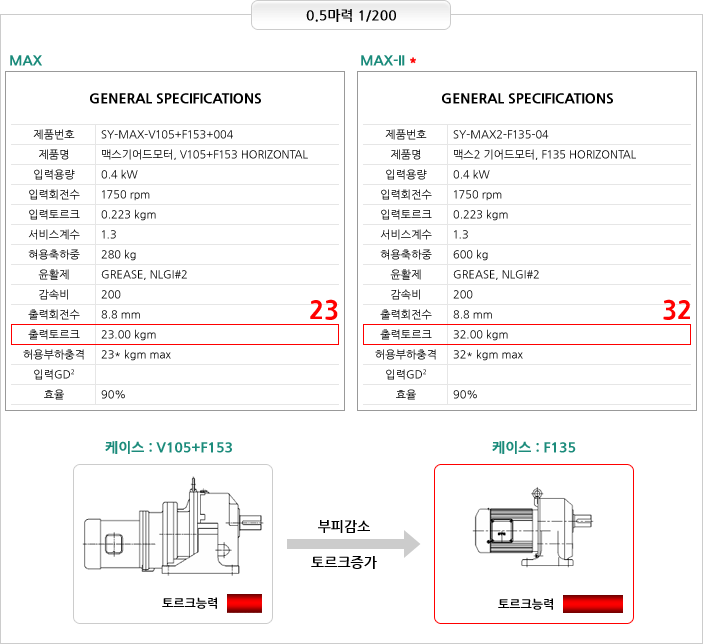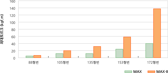 MAX (최대토크) kg.m | MAX-II (최대토크) kg.m | 증가율 | |