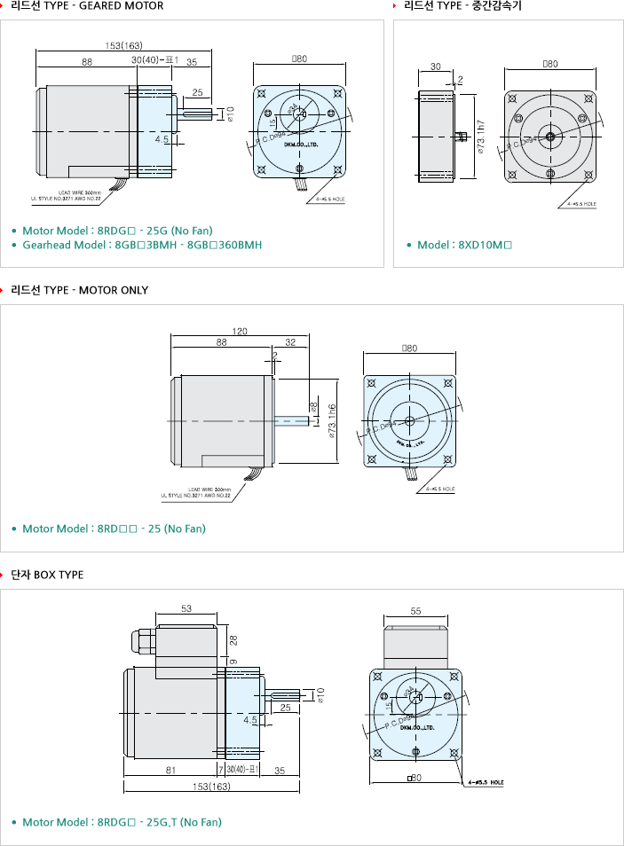 LEAD선 Type | 단자 Box Type | HP | W | VAC | Hz | gfcm | nM.m | oz-in |