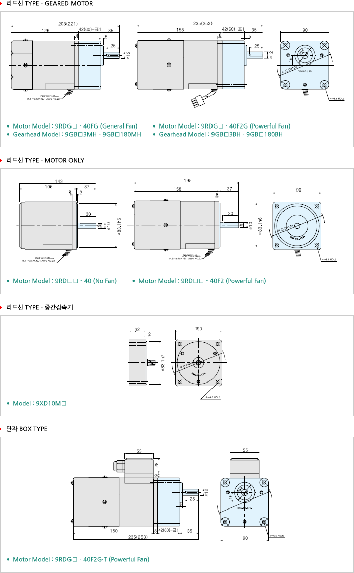 LEAD선 Type | 단자 Box Type | HP | W | VAC | Hz | gfcm | nM.m | oz-in |