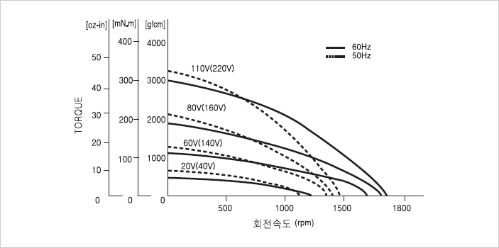 품명 | 회전속도(rpm) | 60 | 50 | 45 | 36 | 30 | 24 | 20 | 18 | 15 | 12 | 10 |