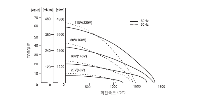 품명 | 회전속도(rpm) | 60 | 50 | 45 | 36 | 30 | 24 | 20 | 18 | 15 | 12 | 10 |