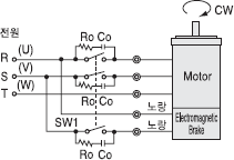 - SW1는 모터와 BRAKE를 작동시킵니다. SW1이 ON 되면 모터가 작동하고 동시에 BRAKE가 작동하여 부하를 유지시킵니다.