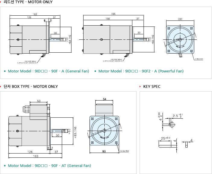 LEAD선 Type | 단자 Box Type | HP | W | VAC | Hz | gfcm | nM,m | oz-in |