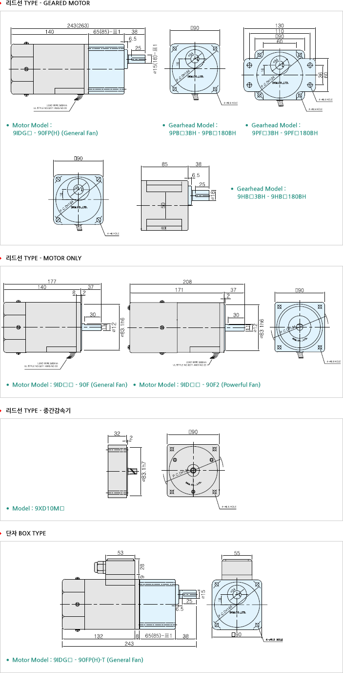 LEAD선 Type | 단자 Box Type | HP | W | VAC | Hz | gfcm | nM.m | oz-in |