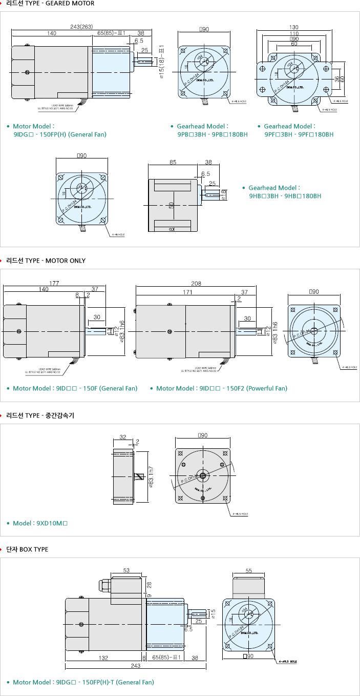 LEAD선 Type | 단자 Box Type | HP | W | VAC | Hz | gfcm | nM.m | oz-in |